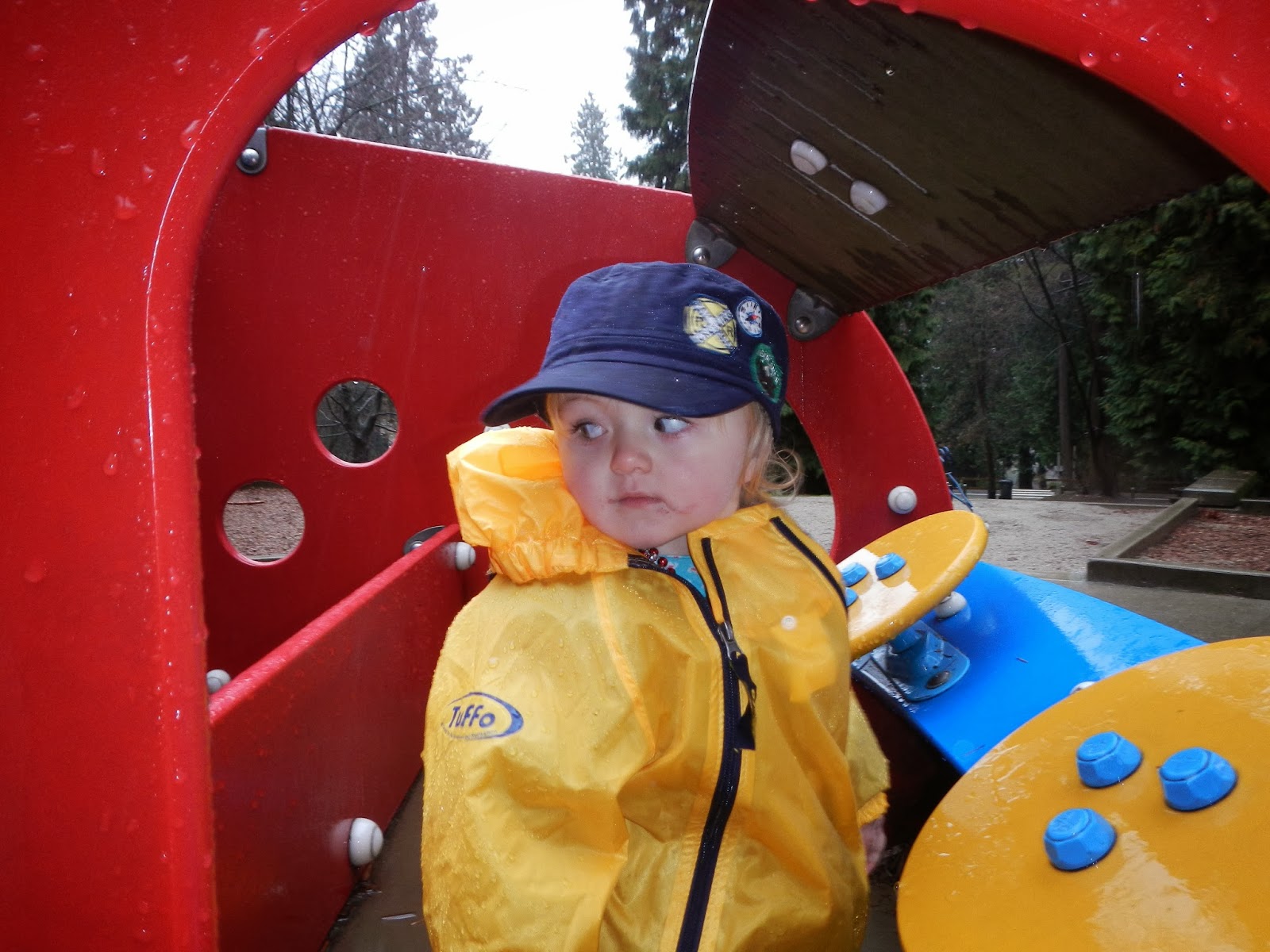 We will need to pick up the pace if we are going to visit 101 playgrounds this year! But that will be easier to do as the weather improves and the days get longer. After work and daycare today, we headed out to Minoru Park in Richmond, very close to Charlotte's daycare and walking distance from my work. Minoru Park has tons of amenities - at the north end, there is a lovely duck pond with a waterfall and a bowling green; at the south end, there are the arenas and sports fields. The playground is right behind the arenas; there are a couple of structures to play on as well as swings and slides. It was a cold and foggy afternoon, but we bundled up well. Charlotte loved the slides and went down the double slide on my knee. She wanted to go again - but just wanted to be lifted to the top of the slide rather than go to the trouble of climbing back up again! She loved the spiral slide too, but it was a little bit high for her for now. I lifted her as high as I could and let her go - but I couldn't keep that up forever!